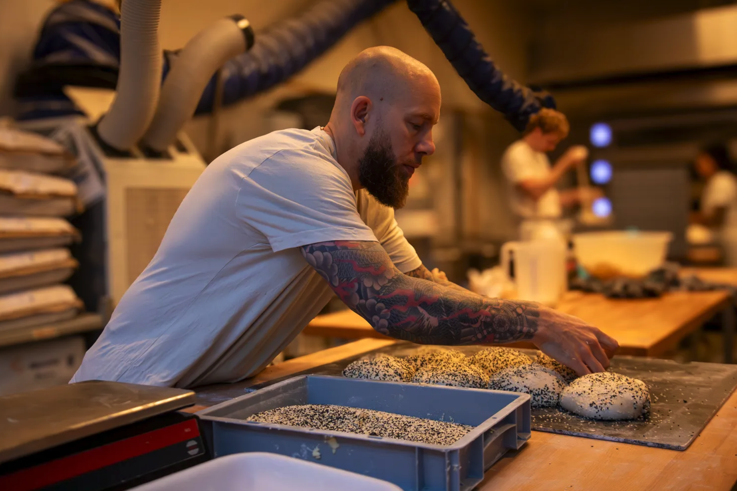 De unit is in tweeën verdeeld; de uitgifte bevindt zich bij de entree in het dubbelhoge gedeelte, de bakkerij bevindt zich achter de uitgifte en gedeeltelijk op de mezzanine. De houten bar en kast voor streekproducten geven de ruimte een kenmerkende uitstraling, contrasterend met de verder rustige unit. In de bakkerskarren achter de bar hangt het ‘menu’, en liggen alle vers gebakken broden. De zitjes op begane grond en mezzanine zijn simpel wit gehouden en versterken zo de display van alle mooie en verse producten. Buiten wordt, bij goed weer, een klein terras met (venster)bankje en losse tafels en stoelen neergezet. Tevens zorgt een A-bord voor de nodige reclame.