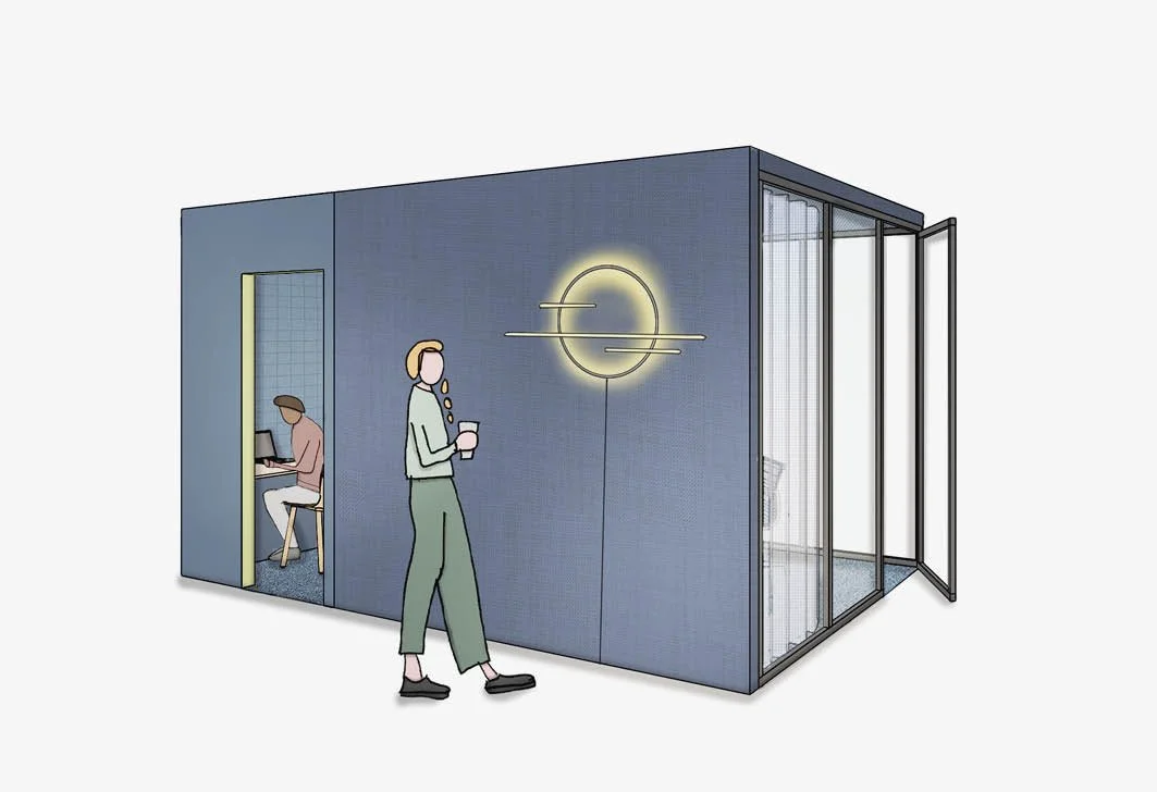 Alle functies zoals vergaderruimtes, opslag, keuken en toiletten zijn ondergebracht in 3 kleurrijke blokjes die speels in de ruimte staan. Elke zijde van een blok toont een andere functie, wat zorgt voor steeds wisselende zichtlijnen en doorkijkjes.